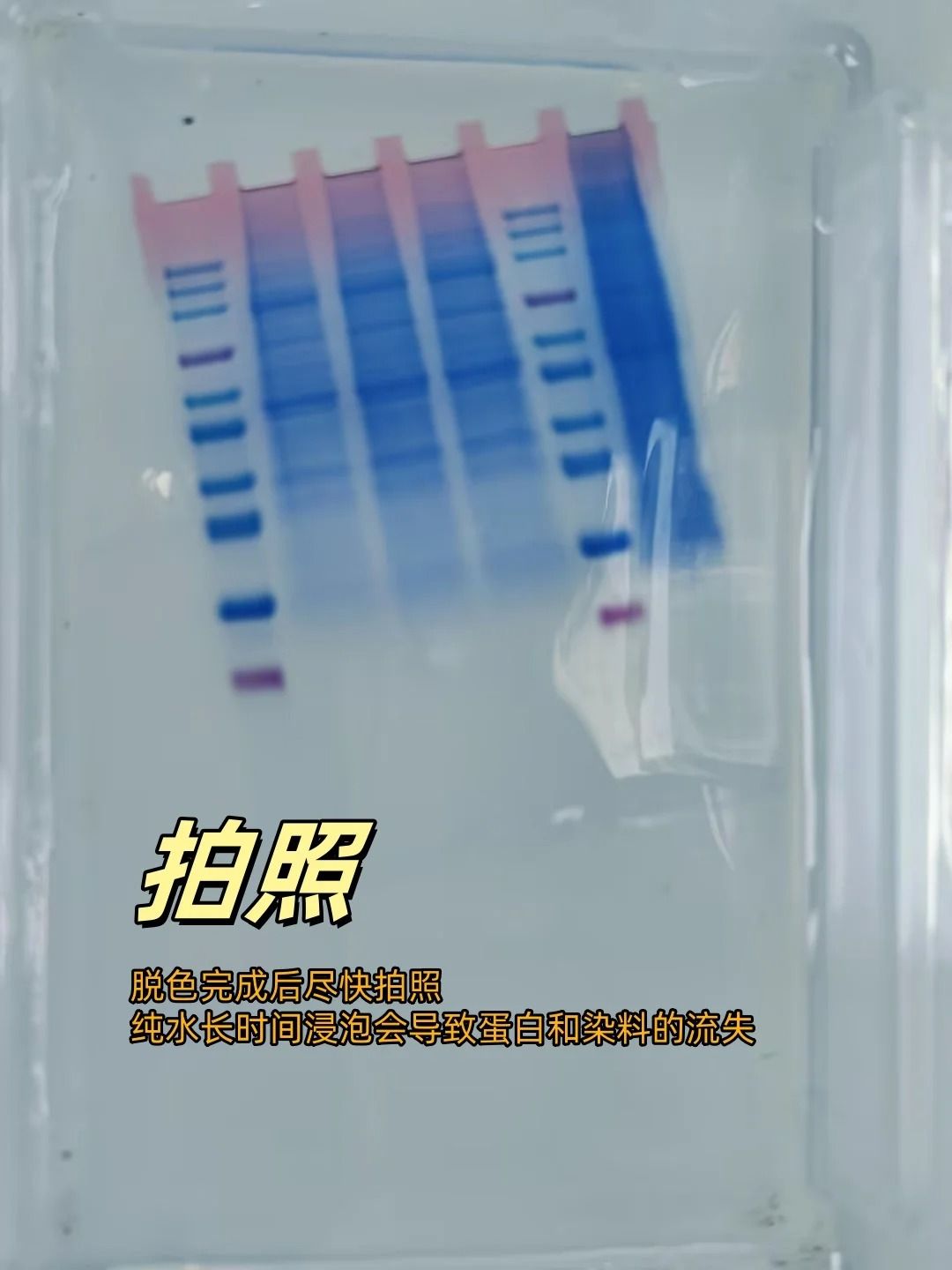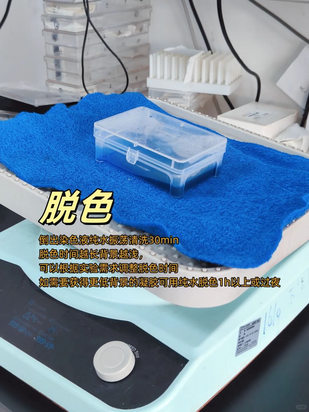 ?4.進行脫色?:將容器放在水平搖床上,室溫下震蕩脫色。脫色時間根據(jù)實驗需求進行調(diào)整,通常為2-3小時或直至背景清晰。如果需要更低背景的凝膠,可以用純水脫色1小時以上或過夜。