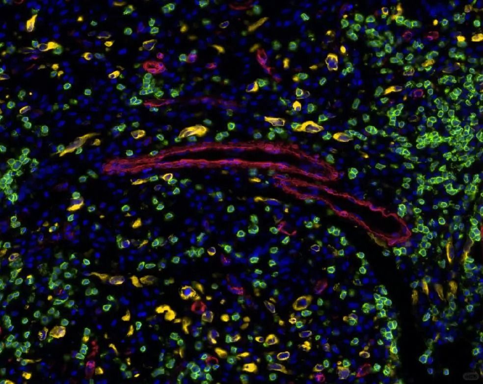 ?其他顏色?:如黃色、綠色、紅色、橙色等,分別標記不同的靶標蛋白,如CD4(標記特定輔助T細胞)、CD8(標記細胞毒性T細胞)、CD16(標記自然殺傷細胞NK細胞)、CD68(標記巨噬細胞)等。