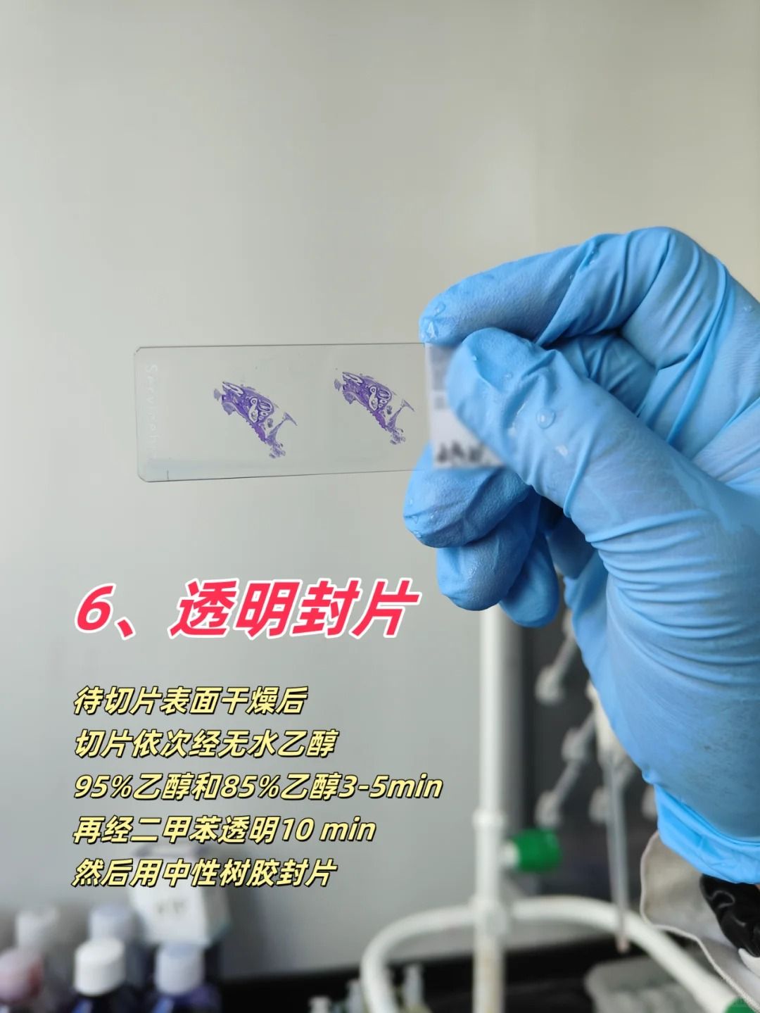 Step12:在石蠟切片的中央滴加一滴中性樹膠,然后蓋上蓋玻片進(jìn)行封固。封片時(shí)要避免產(chǎn)生氣泡,以免影響觀察效果。