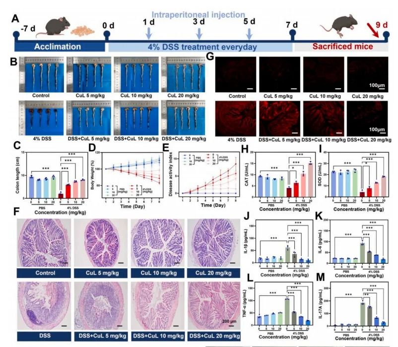 4.動(dòng)物模型:在典型的IBD小鼠模型(如潰瘍性結(jié)腸炎和克羅恩病)中驗(yàn)證CuL NCs的預(yù)防和治療效果。