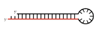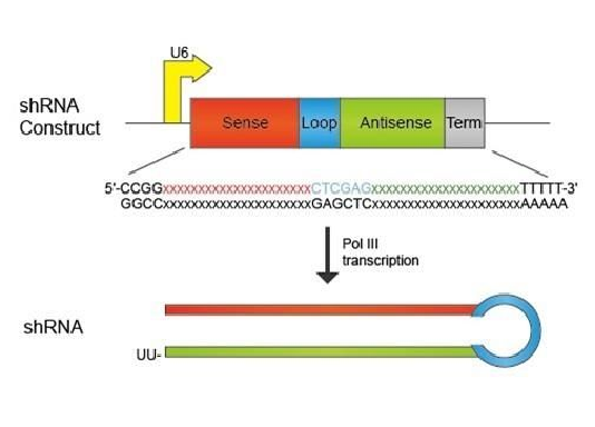 短發(fā)夾RNA(short hairpin RNA,簡稱shRNA)是一種具有環(huán)狀結構的RNA分子。shRNA由兩個短反向重復序列和一個中間的莖環(huán)(loop)序列組成,整體呈發(fā)夾狀結構。shRNA通常由pol Ⅲ啟動子控制轉錄。