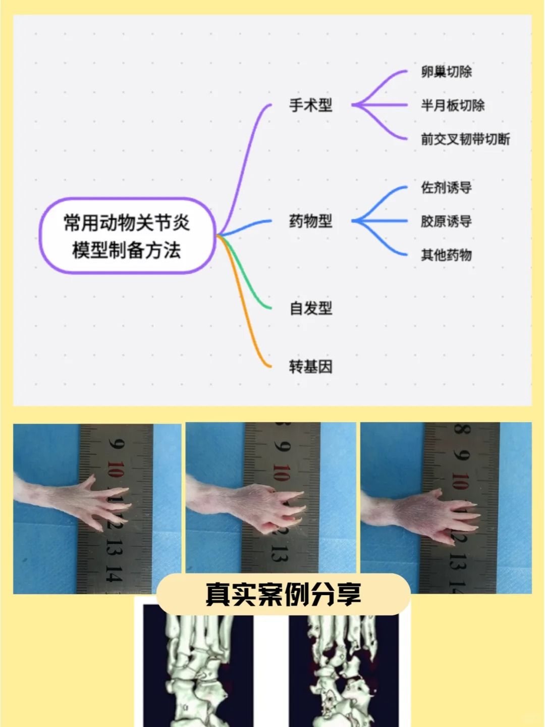 關(guān)節(jié)炎模型造模方法多種多樣,每種方法都有其獨(dú)特的優(yōu)點(diǎn)和局限性。研究人員應(yīng)根據(jù)實(shí)驗(yàn)?zāi)康暮蜅l件選擇最適合的模型。