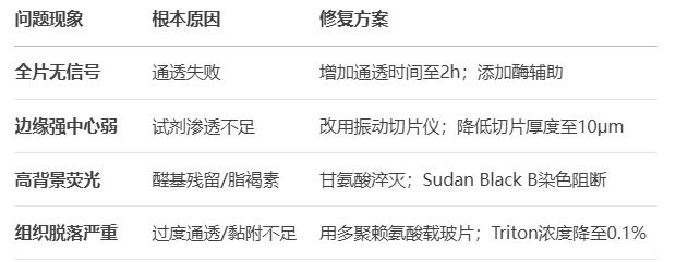 →通透不足:組織致密結(jié)構(gòu)阻礙試劑滲透,深部細胞標(biāo)記失敗