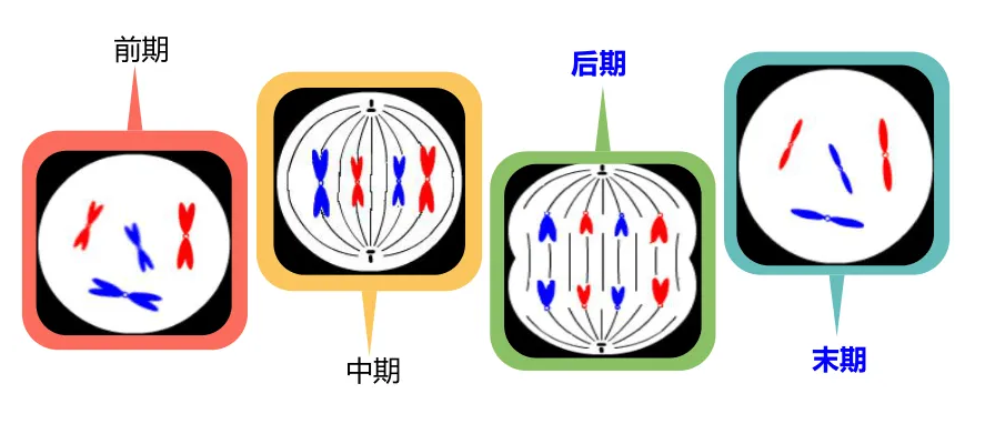 有絲分裂的細胞周期變化中最明顯變化是細胞核中染色體的變化。人們?yōu)榱搜芯糠奖?,把分裂期分為四個時期:前期,中期,后期,末期。其實,分裂期的各個時期的變化是連續(xù)的,并沒有嚴格的時期界限。