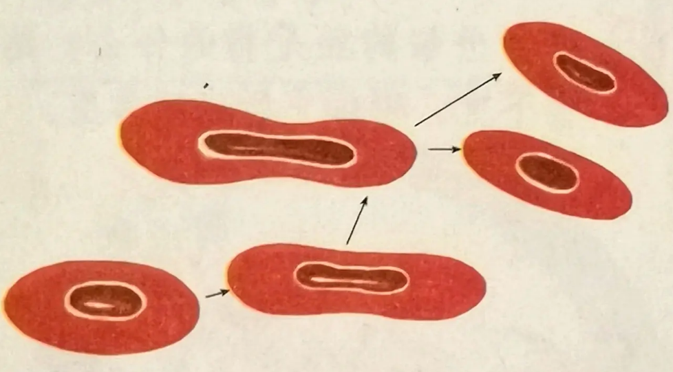 其次就是細胞無絲分裂。細胞無絲分裂的過程比較簡單,一般是細胞核先延長,從核的中部向內(nèi)凹進,縊裂成為兩個細胞核;接著,整個細胞從中部縊裂成兩部分,形成兩個子細胞。因為分裂過程中沒有出現(xiàn)紡錘絲和染色體,所以叫做無絲分裂。