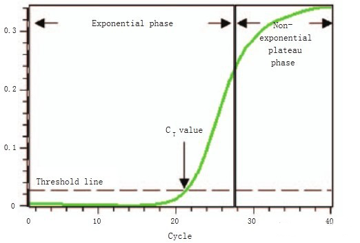 擴(kuò)增曲線 早期循環(huán)中,熒光信號(hào)幾乎沒(méi)有變化。隨著反應(yīng)的進(jìn)行,每個(gè)循環(huán)的熒光水平開始顯著上升,被稱為指數(shù)期。一般在在指數(shù)期的早期階段而不是后期的平臺(tái)期進(jìn)行定量分析。在指數(shù)階段開始時(shí),所有的試劑仍然是過(guò)量的,DNA聚合酶仍然高效,并且擴(kuò)增產(chǎn)物量還較低,不會(huì)在退火時(shí)與引物競(jìng)爭(zhēng)。這些因素都有助于更準(zhǔn)確的定量。