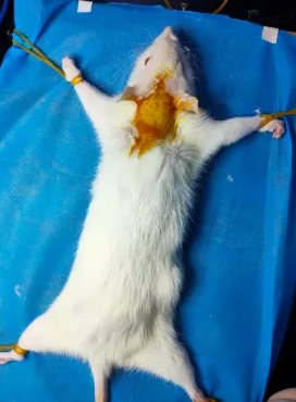 3、待大鼠麻醉后采取仰臥位固定于操作臺(tái)。