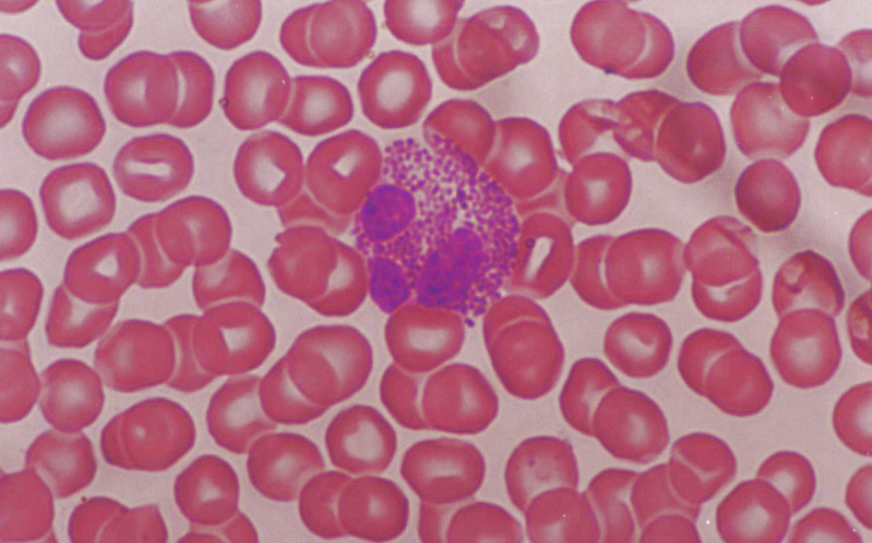 嗜堿性粒細(xì)胞(Basophils)是骨髓和血液中最不常見的細(xì)胞之一,其數(shù)量小于細(xì)胞總數(shù)的2%。該細(xì)胞也也具備分葉的細(xì)胞核,但其細(xì)胞核僅有兩葉,連接兩葉之間的染色質(zhì)不明顯。感染發(fā)生時(shí),成熟嗜堿性粒細(xì)胞會(huì)離開骨髓并抵達(dá)感染處。嗜堿性粒細(xì)胞受傷后釋放組胺而引發(fā)炎癥反應(yīng)以抵抗感染。組胺使嗜堿性粒細(xì)胞附近的毛細(xì)血管擴(kuò)張并使其滲透性增強(qiáng)。受傷的嗜堿性粒細(xì)胞和其他白細(xì)胞會(huì)釋放前列腺素以加快感染處的血液流動(dòng)。