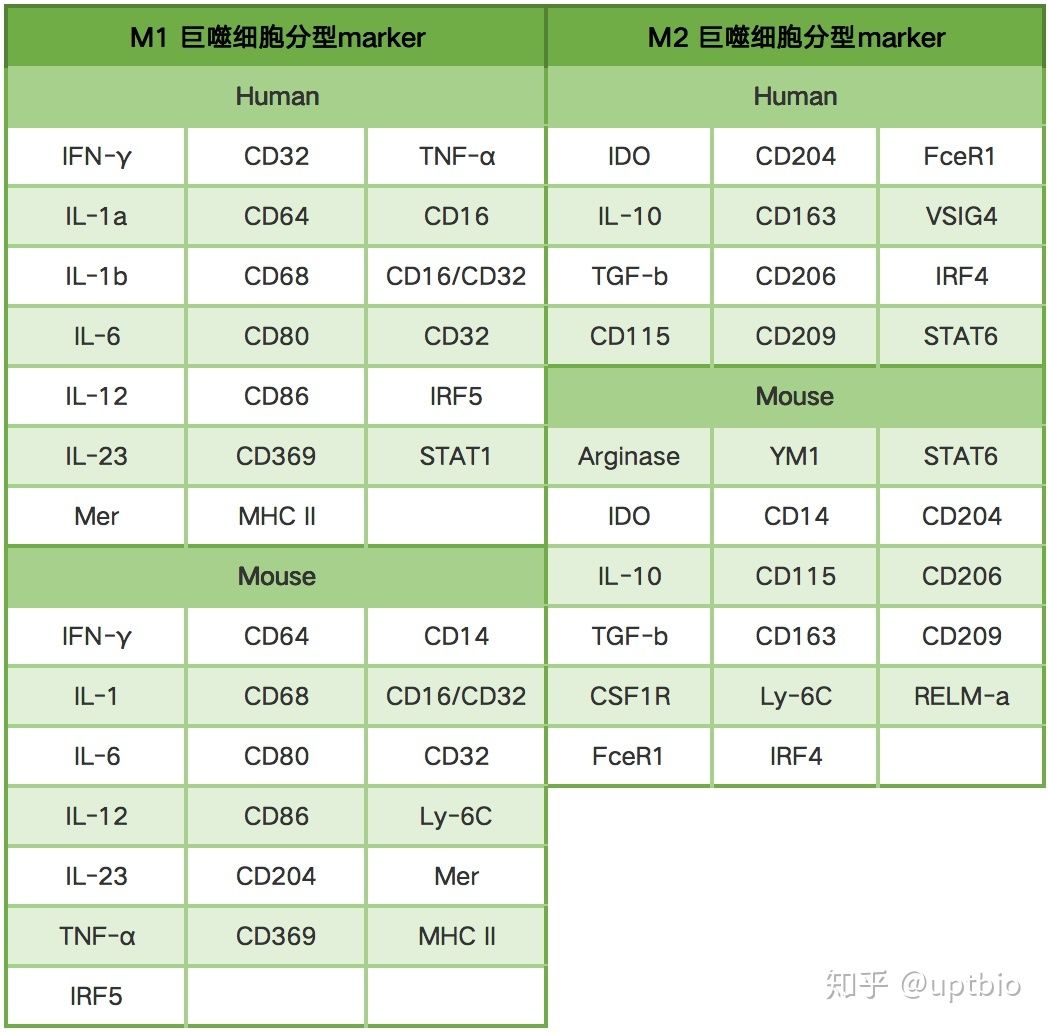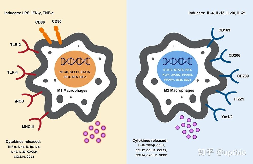 M1型巨噬細胞表達MHC II、CD80、CD86和 CD16/32,分泌TNF-α、IL-6和IL-12等促炎因子,以及CXCL9、CXCL10和CXCL11等趨化因子。另外,M2型巨噬細胞高表達arginase-1(Arg1)和CD206,分泌抗炎因子IL-10以及CCL2、CCL17和CCL22等趨化因子(如下圖)。