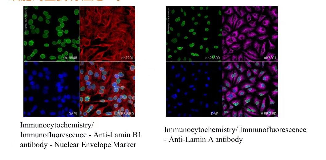 核膜的Marker通常選用核纖層蛋白LaminB和LaminA/C。這兩種蛋白是核膜內(nèi)側(cè)核纖層的主要組成成分,也會與其他蛋白一起錨定在核膜上,因此被廣泛用作核膜的Marker。