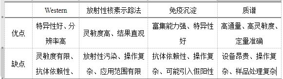 除質(zhì)譜外還有一些其他的方法可以檢測蛋白質(zhì)的翻譯后修飾,如Western Blot、放射性核素示蹤法、免疫沉淀(IP)等,下表展示了各類實驗方法檢測蛋白質(zhì)翻譯后修飾的優(yōu)缺點。