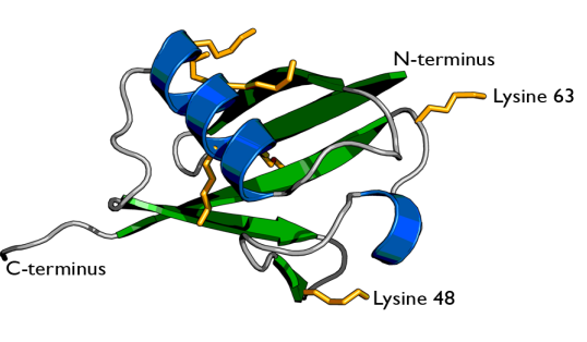 今天我們要學(xué)習(xí)的第二個蛋白質(zhì)翻譯后修飾的類型是泛素化,在這之前也需要了解一些背景知識。首先問大家一個問題,什么是泛素?泛素是含76個氨基酸、大小約為8.6 kDa的小蛋白質(zhì)。人類基因組中有四個基因編碼泛素:UBB,UBC,UBA52和RPS27A,泛素蛋白的氨基酸序列為:MQIFVKTLTGKTITLEVEPSDTIENVKAKIQDKEGIPPDQQRLIFAGKQLEDGRTLSDYNIQKESTLHLVLRLRGG。泛素具有7個賴氨酸殘基(K6,K11,K27,K29,K33,K48,K63)和一個甲硫氨酸殘基(M1)。泛素之間主要通過賴氨酸殘基和甲硫氨酸殘基進(jìn)行連接,由此產(chǎn)生的泛素鏈具有一定的拓?fù)浣Y(jié)構(gòu),可通過對蛋白底物進(jìn)行修飾并決定底物的功能。