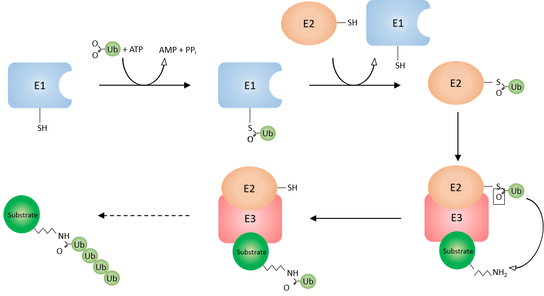泛素化的過程主要涉及三種酶類,分別是泛素激活酶E1、泛素結(jié)合酶E2、泛素連接酶E3。人源的E1酶類有2種:UBA1和UBA6;人源的E2酶類有35種;人源E3酶類有數(shù)百種。其中E3泛素化連接酶決定靶蛋白的特異性識別。泛素化的過程具體可分為以下三個步驟:活化、結(jié)合、連接(動畫演示)