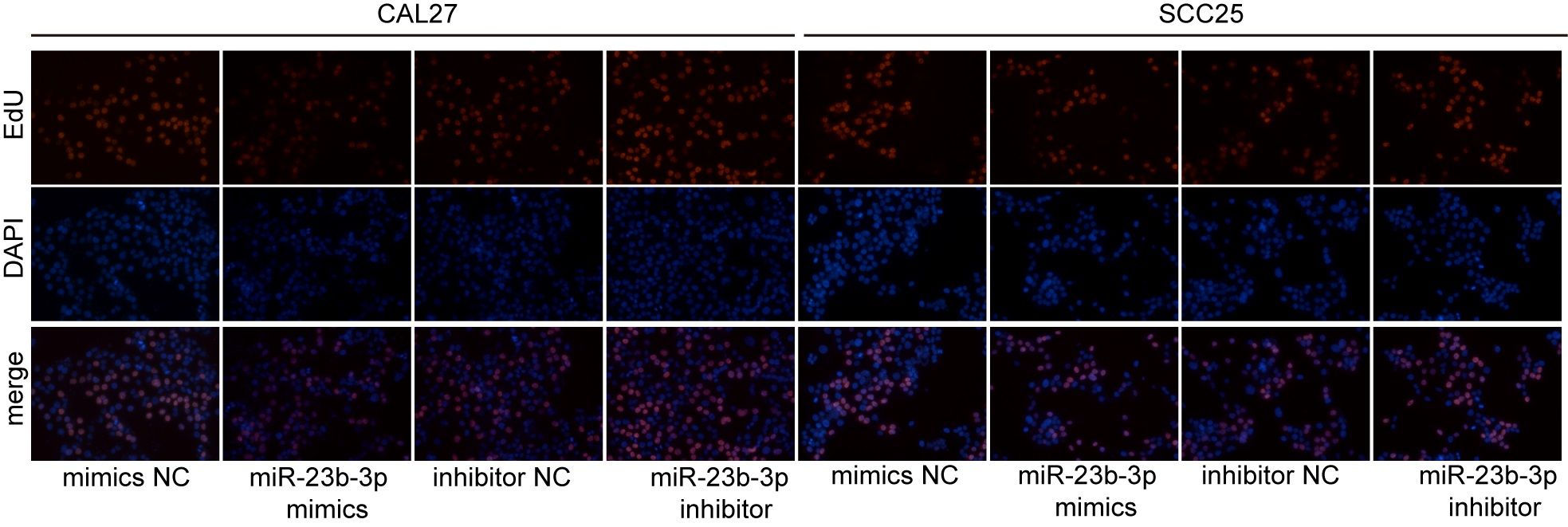 如圖所示,在CAL27細(xì)胞中,mimics NC和miR-23b-3p mimics組間無明顯差異,與inhibitorNC組相比,miR-23b-3p inhibitor組細(xì)胞增殖能力有所上調(diào);SCC25細(xì)胞各組間無明顯差異。