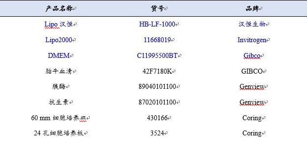 (3) 質粒和脂質體準備:用500 μL的不含血清的培養(yǎng)基孵育8μg的質粒;500 μL的不含血清的培養(yǎng)基孵育16μL的 Lipo3000,靜置5 min;將含質粒和含有脂質體的培養(yǎng)基混合,混勻后室溫靜置20 min。