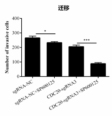 通過Transwell實驗檢測Hela細胞轉染CDC20-sgRNA3或SP600125處理后其遷移能力的變化。