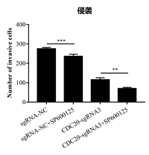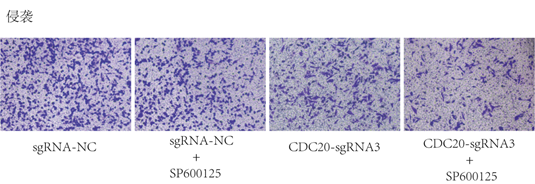 通過Transwell實驗檢測Hela細胞轉(zhuǎn)染CDC20-sgRNA3或SP600125處理后其侵襲能力的變化。
