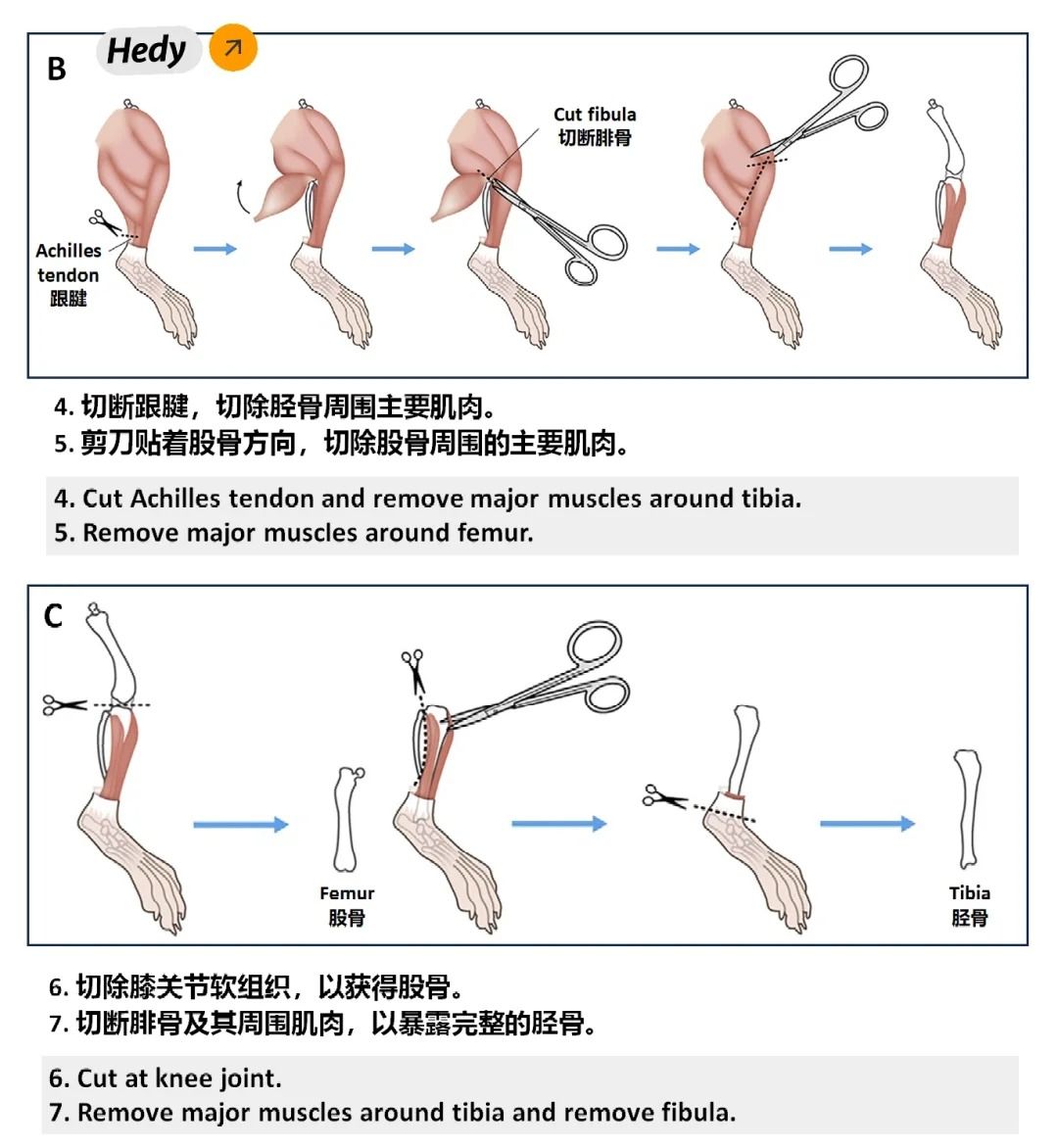 ①處死小鼠后,用剪刀和鑷子取出其雙側(cè)股骨和脛骨,剔除附著的肌肉和組織。
