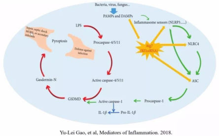 在病原體感染時,適度的細(xì)胞焦亡可清除致病微生物,而過度的細(xì)胞焦亡在導(dǎo)致細(xì)胞死亡的同時,釋放炎癥因子,擴大炎癥反應(yīng),造成發(fā)熱,低血壓、敗血癥等癥狀。以敗血癥為例,敗血癥是由致病菌侵入血液系統(tǒng),并在其中生長繁殖,產(chǎn)生毒素,引起全身性感染,最新研究表明,細(xì)胞自噬相關(guān)基因Atq7沉默后,可激活細(xì)胞焦亡途徑。