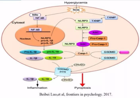 1、因代謝障礙或代謝旺盛等原因引起的疾病稱為代謝性疾病,常見的有糖尿病、痛風(fēng)、糖尿病性心肌病等。以糖尿病性心肌病為例,由心肌細(xì)胞死廣引起,最新的研究顯示高血糖可以造成活性氧的產(chǎn)生增加,進而上調(diào)NF-KB和TXNIP,NF-KB又可以上調(diào)NLRP3IL-1B前體以及IL-18前體的表達:TXNIP通過改變NLRP3的結(jié)構(gòu)激活Caspase-1活化的Caspase-1-方面切割GasderminD,形成含有GasderminD氮端活性域的肽段,誘導(dǎo)心肌細(xì)胞膜穿孔、破裂,釋放內(nèi)容物,引起炎癥反應(yīng);另一方面,活化的Caspase-1對IL-1β和IL-18的前體進行切割,形成有活性的IL-1β和IL-18,并釋放到胞外,募集炎癥細(xì)胞聚集,擴大炎癥反應(yīng)。