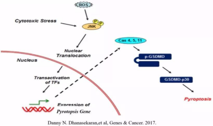 1、研究發(fā)現(xiàn),在ROS及細(xì)胞毒素的作用下,JNK激酶被激活并轉(zhuǎn)移到細(xì)胞核內(nèi),促進焦亡相關(guān)基因的表達,啟動焦亡的形成,控制腫瘤的發(fā)展。