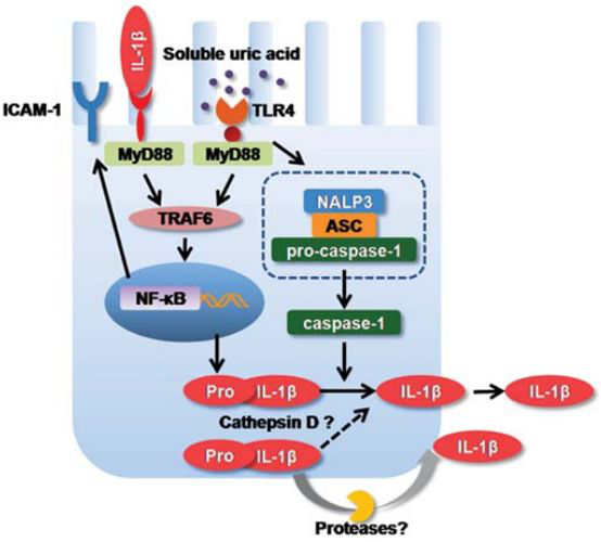 (3)晶體相關(guān)性腎病研究發(fā)現(xiàn)以含100ug/mL尿酸培養(yǎng)液培養(yǎng)腎小管上皮細(xì)胞發(fā)現(xiàn)TLR4 NLRP3、Caspase-1IL-1?表達的增加,予以TLR4的阻滯劑TAK242干預(yù)后NLRP3 Caspase-1IL-1的表達明顯減少,說明尿酸可通過TLR4激活NLRP3及下游焦亡信號因子,導(dǎo)致腎臟炎癥反應(yīng)及細(xì)胞焦亡。參考文獻:Soluble uric acid increases NALP3 inflammasome and interleukin-1βexpression in human primary renal proximaltubule epithelial cells through the Toll-like receptor 4- mediated pathway.