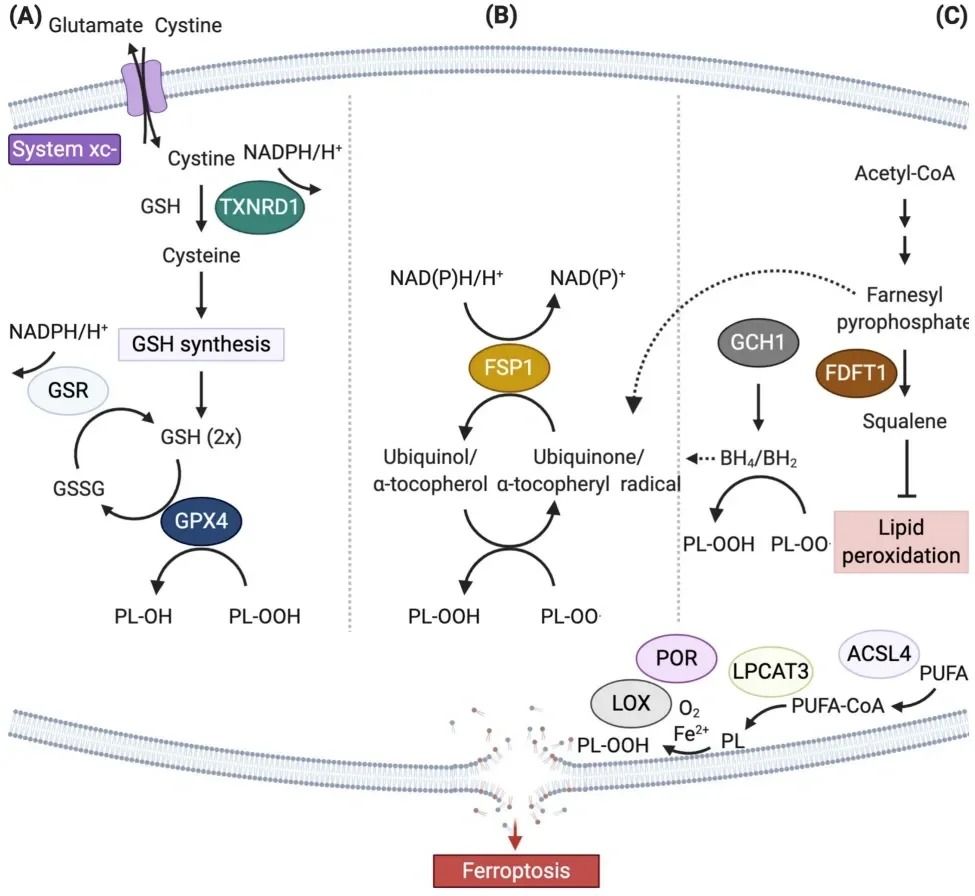 鐵死亡的主要機制是在二價鐵或酯氧合酶的作用下,催化細胞膜上的不飽和脂肪酸發(fā)生脂質過氧化,從而誘導細胞死亡。此外,還表現(xiàn)為抗氧化體系(谷胱甘肽系統(tǒng))的調控核心酶GPX4的降低。