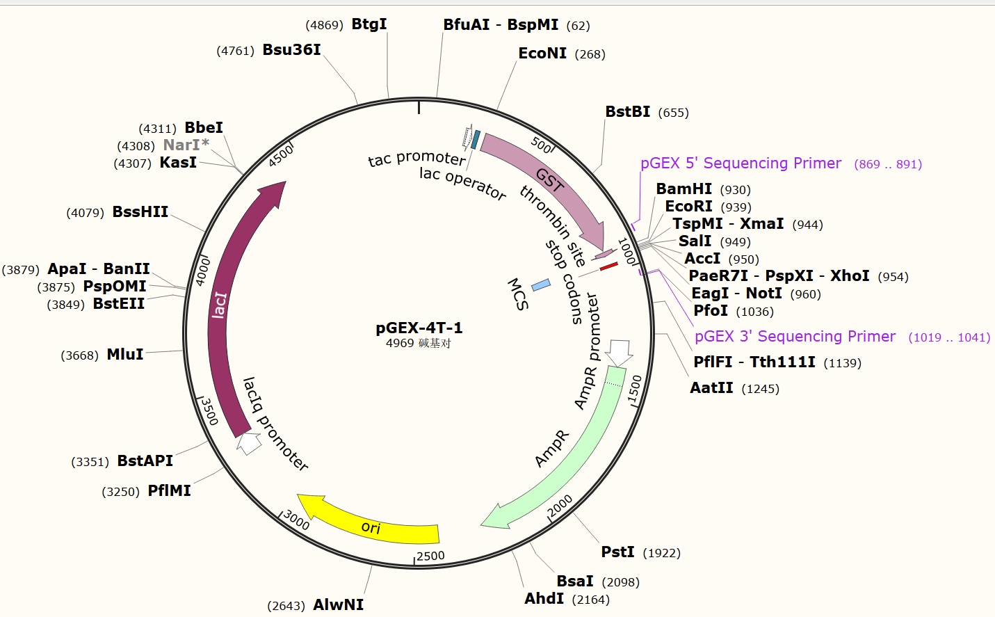 而pGEX -4T通常帶有GST標(biāo)簽,GST標(biāo)簽是由谷胱甘肽S-轉(zhuǎn)移酶的基因序列編碼的一段多肽序列,。這段序列通常被融合到目標(biāo)蛋白的N端或C端,用于后續(xù)的純化和檢測。通過利用谷胱甘肽與GST之間的強(qiáng)親和力,可以使用谷胱甘肽瓊脂糖凝膠等親和層析材料將帶有GST標(biāo)簽的蛋白從混合物中分離出來。GST標(biāo)簽表達(dá)出來的蛋白分子量比較大,有26KDa,如此大的蛋白質(zhì)會影響我們目的蛋白的結(jié)構(gòu),因此在蛋白表達(dá)出來后我們需要使用相應(yīng)的酶將GST標(biāo)簽切下來以得到只含有目的基因表達(dá)出來的蛋白。