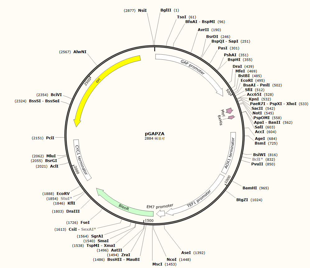 畢赤酵母非分泌型表達(dá)載體的一個典型例子是pGAPZ 系列,該系列包含A,B,和C載體,都使用GAP啟動子在畢赤酵母中穩(wěn)定表達(dá)重組蛋白。GAP啟動子的重組蛋白表達(dá)水平略高于AOX1啟動子。同時也含有BIeoR博來霉素抗性基因,該載體同樣帶有Myc和His標(biāo)簽,后續(xù)可以對表達(dá)的蛋白進(jìn)行純化。其實大部分的結(jié)構(gòu)元件跟上面那個載體一樣,其中最大的區(qū)別在于分泌型載體上帶有的α-因子分泌信號在非分泌型載體上不存在,這也是分泌型載體之所以叫分泌型載體的原因。