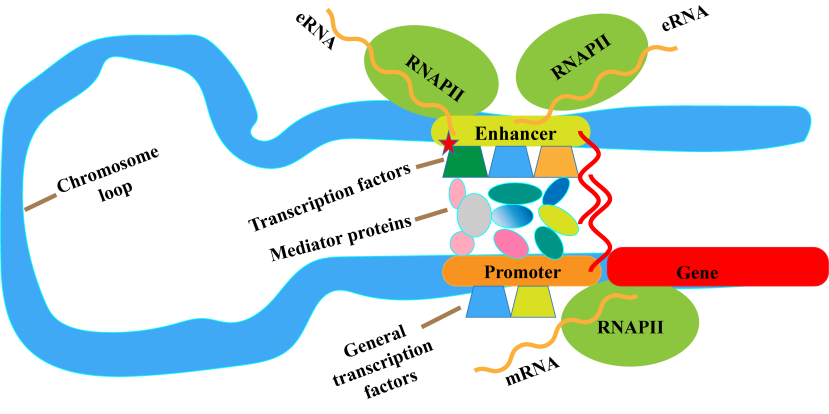 圖中的梯形狀的結(jié)構(gòu)代表轉(zhuǎn)錄因子,在轉(zhuǎn)錄因子那節(jié)的視頻中我們介紹了,轉(zhuǎn)錄因子分為通用轉(zhuǎn)錄因子和激活因子,通用轉(zhuǎn)錄因子只能激活很低水平的轉(zhuǎn)錄,細胞中活躍基因的轉(zhuǎn)錄通常遠遠高于本地轉(zhuǎn)錄,要達到所需的轉(zhuǎn)錄增強,通常需要激活因子來激活高水平的轉(zhuǎn)錄,而激活因子通常需要跟增強子結(jié)合從而才能達到激發(fā)高水平轉(zhuǎn)錄的作用。特定的轉(zhuǎn)錄因子(也就是激活因子)與增強子結(jié)合,而普通轉(zhuǎn)錄因子和啟動子結(jié)合。激活因子結(jié)合到增強子上(圖中紅色五角星),增強子被激活,被激活的增強子進一步激活靶基因的啟動子,遠距離的啟動子是如何被激活的呢?在增強子和啟動子之間會有一個酶介,這個酶介叫Mediator protein中介蛋白,這個蛋白大約由26個蛋白組成的復(fù)合物,被激活的這個增強子通過中間這個蛋白復(fù)合體,將信號傳遞給啟動子,從而激活啟動子開始轉(zhuǎn)錄,開始轉(zhuǎn)錄以后在RNA聚合酶2的作用下就可以開始轉(zhuǎn)錄形成mRNA,同時這個增強子它也會在這個RNA聚合酶2的作用下形成eRNA。)
