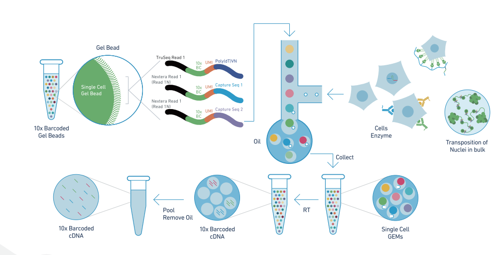 Barcoding Technology)標(biāo)記的細(xì)胞,用轉(zhuǎn)座酶處理的細(xì)胞核。接下來(lái)凝膠珠和單個(gè)細(xì)胞被油-表面活性劑溶液包裹,形成