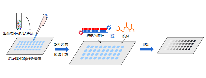 在斑點(diǎn)雜交中,要檢測到的生物分子不是首先通過電泳分離出來的,相反,將含有被檢測分子的混合物直接點(diǎn)在膜上,烘烤固定。然后用核苷酸探針(Northern blot、Southern blot)或抗體(Western blot)雜交后檢測。這種方法耗時(shí)短,可做半定量分析。一張膜上可同時(shí)檢測多個(gè)樣品。