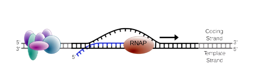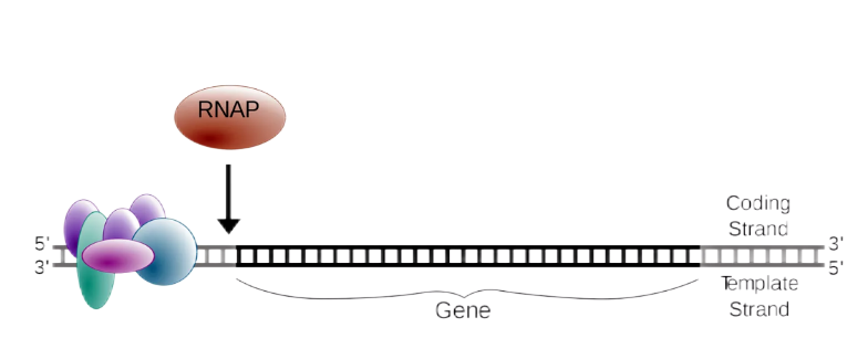 起始:RNA聚合酶對轉(zhuǎn)錄起始位點上游的DNA序列進行辨認,同時打開DNA雙螺旋結(jié)構(gòu),依賴轉(zhuǎn)錄因子結(jié)合啟動子形成復(fù)合物。