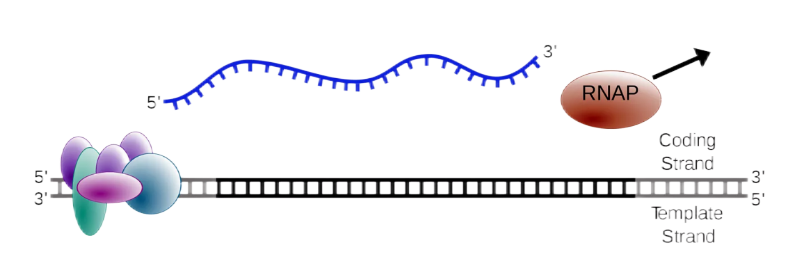 轉(zhuǎn)錄:是以DNA為模板,以4種NTP為原料,依據(jù)堿基配對規(guī)律,在DNA 指導(dǎo)(或依賴 DNA)的 RNA聚合酶催化下合成RNA的過程。真核生物的轉(zhuǎn)錄涉及許多的酶類以及蛋白因子,其中最重要的是轉(zhuǎn)錄因子和RNA聚合酶。
