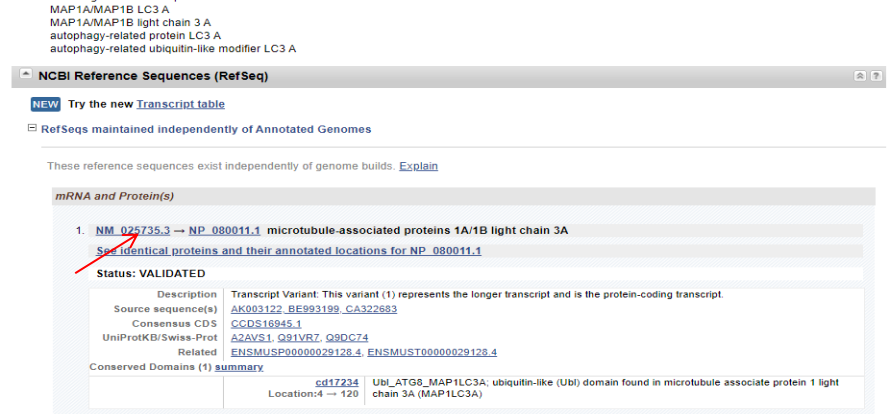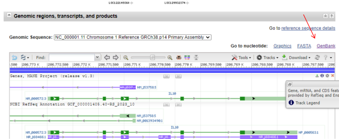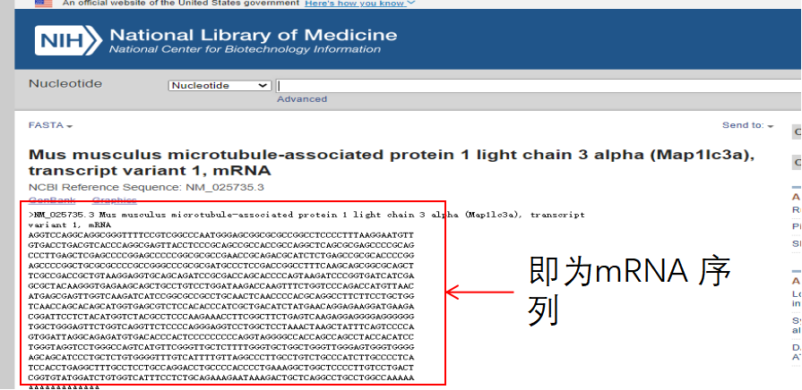mRNA和Protein序列:點擊NM開頭的轉(zhuǎn)錄本,跳轉(zhuǎn)進去就是mRNA,點擊Fasta,就可以下載mRNA序列;點擊NP就能得到mRNA對應(yīng)的蛋白序列。